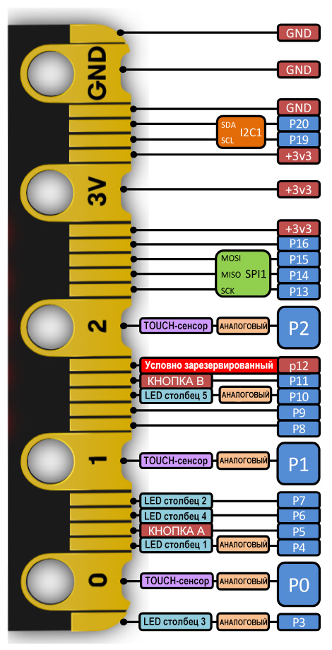 | P4 | P0.28/AIN4 | Вывод | LED столбец 1, GPIO, Аналоговый, PWM, UART | - |