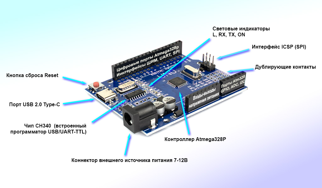 Основной контроллер AVR Atmega328 платы UNO R3 работает на частоте 16МГц, располагает встроенной памятью ОЗУ/ПЗУ и множеством цифровых портов с 5-вольтовой логикой, поддерживает аналоговые функции и прерывания. Использование UNO R3 328P CH340 Type-C с полноформатными модулями расширения (шилдами) для Arduino обеспечивается наличием 6-пинового коннектора ICSP (ISP). Запись кода пользовательского приложения в контроллер Atmega328 осуществляется в бесплатной интегрированной среде Arduino IDE без использования внешнего программатора, простым подключением к USB порту ПК. Универсальные коммуникационные интерфейсы последовательной связи UART, I2C/TWI и SPI контроллера AVR Atmega328 позволяют с легкостью взамодействовать с разнообразными датчиками и сенсорами, дисплеями, инерционными модулями, радиопередатчиками и другим внешним оборудованием.