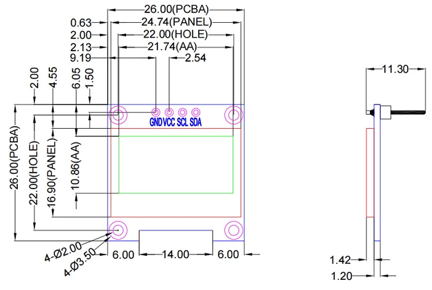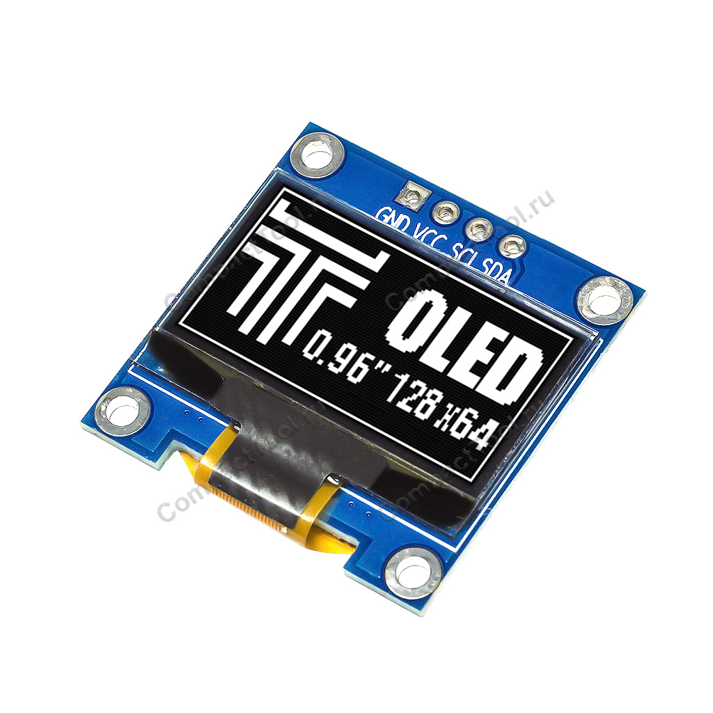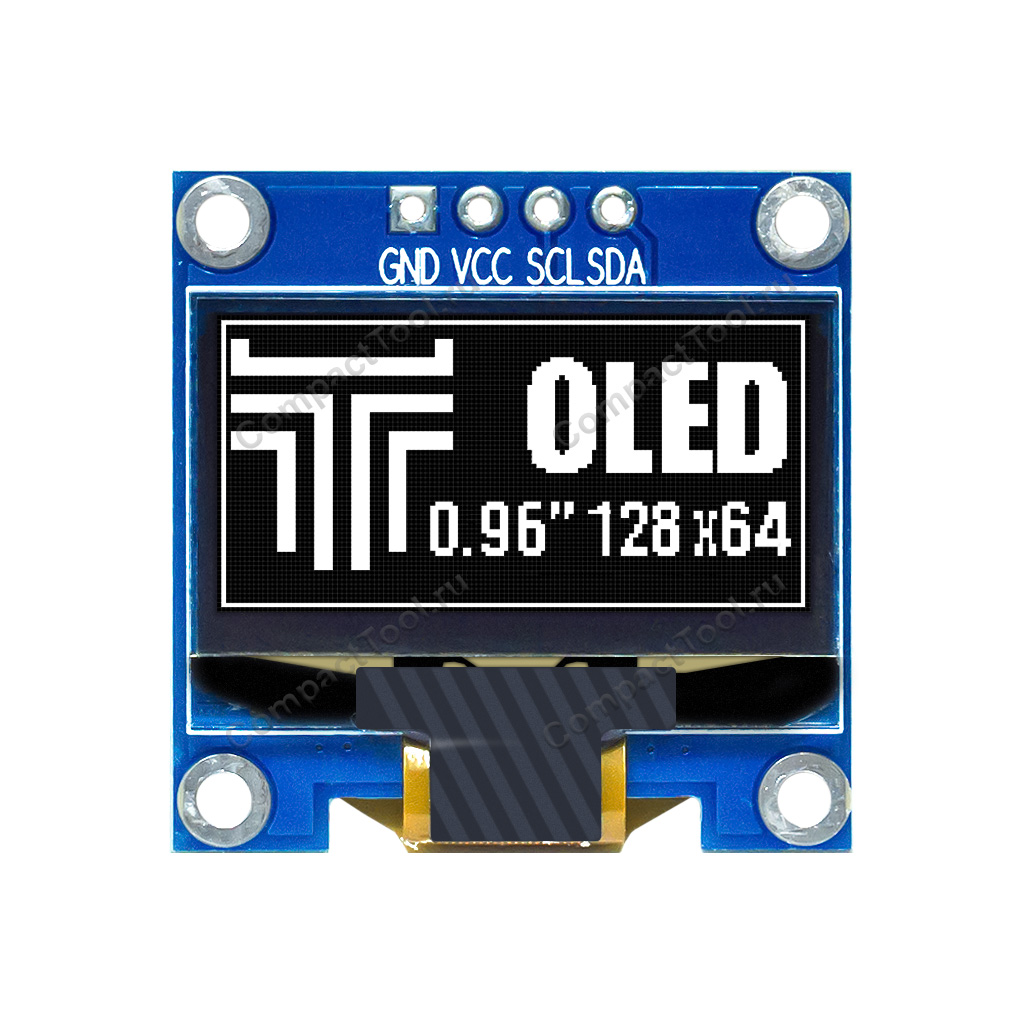 Графические матрицы, изготовленные по технологии OLED, обладают высокой энергоэффективностью. Пиксели в OLED-матрице самостоятельно светятся под воздествием электрического тока, фоновая светодиодная подстветка им не требуется. Благодаря самосвечению, матрицы OLED тоньше и легче, потребляют в разы меньше энергии. Компактный модуль с высококачественным монохромным OLED-дисплеем с диагональю 0.96" (около 24 мм) имеет графическое разрешение 128х64 пикселей, отличается от других типов ЖК-матриц высокой контрастностью и чёткостью выводимого изображения. Встроенный графический контроллер SSD1315 аппаратно поддерживает регулировку контрастности и несколько функций обработки изображения, такие как зеркальное отображение, прокрутка и т.д. Модуль оснащён 2-проводным последовательным интерфейсом I2C/IIC/TWI и функционирует от напряжения +3.3В ~ +5В постоянного тока DC. При максимальном уровне свечения всех пикселей, потребляет не более 80 мА постойного тока, что позволяет использовать его в различных устройствах с автономным питанием.
