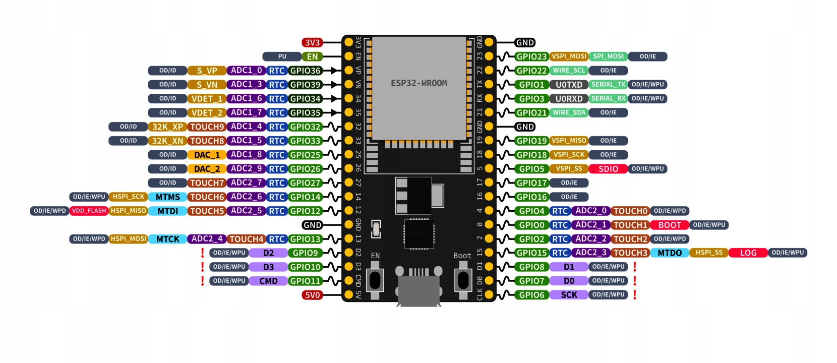Ввод-вывод: SD-карта, UART, SPI, SDIO, I2C, ШИМ светодиодов, ШИМ двигателя, I2S, ИК, счетчик импульсов, GPIO, емкостный датчик касания, АЦП, ЦАП, TWAI® (совместим со спецификацией ISO11898-1 CAN 2.0)