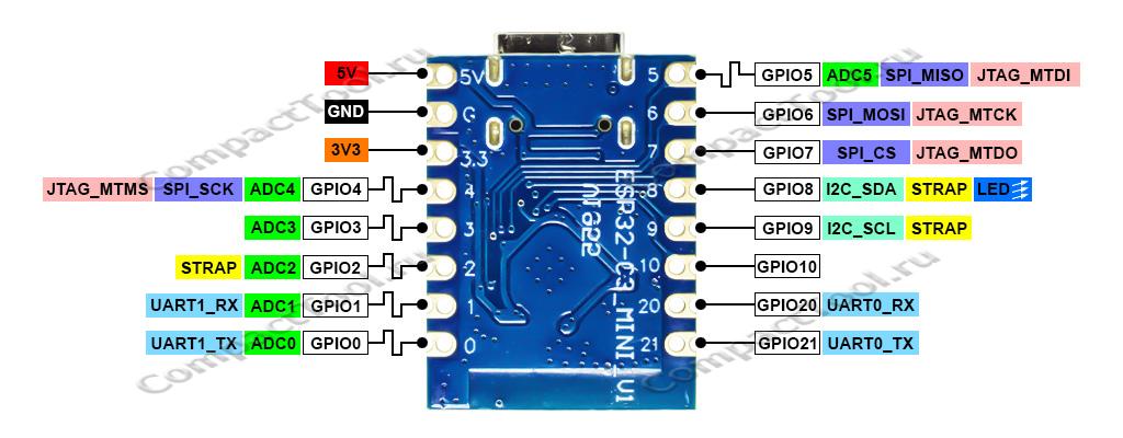 | 0 | Ввод-вывод | GPIO0 Контакт общего назначения ESP32-C3 Аналоговый вход ADC0 Интерфейс UART1 канал исходящих данных TXD Выход с поддержкой ШИМ |