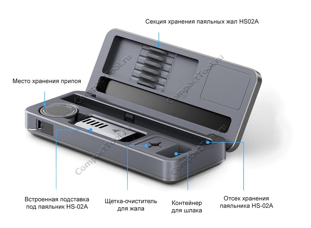 Кейс-органайзер FNiRSi HS-02A Toolbox — эксклюзивное профессиональное решение для хранения паяльника HS-02A. Стильный и прочный кейс-органайзер FNiRSi HS-02A Toolbox позволяет в любом месте быстро организовать рабочее место. Для достижения максимального удобства в повседневном использовании, внутри этого органайзера уже предусмотрены откидная подставка под HS-02A, поворачивающаяся на угол до 100°, и щётка из металлической стружки для очистки жала от флюсов или излишек припоя. Кроме самого нагревательного прибора, в кейсе FNiRSi HS-02A Toolbox можно также свободно хранить до пяти паяльных жал различной формы и кабель питания HS-02. Внутри корпуса имеется круглая секция со свободно вращающейся катушкой, предназначенной для намотки паяльной нити. Специальное прямоугольное отверстие на боку кейса обладает магнитной застёжкой, надёжно удерживающей и закрывающей конец паяльной нити. В качестве бонуса, в комплектацию FNiRSi HS-02A Toolbox дополнительно входит 42 грамма бессвинцового, оловянного-медного припоя толщиной 0.8 миллиметра.