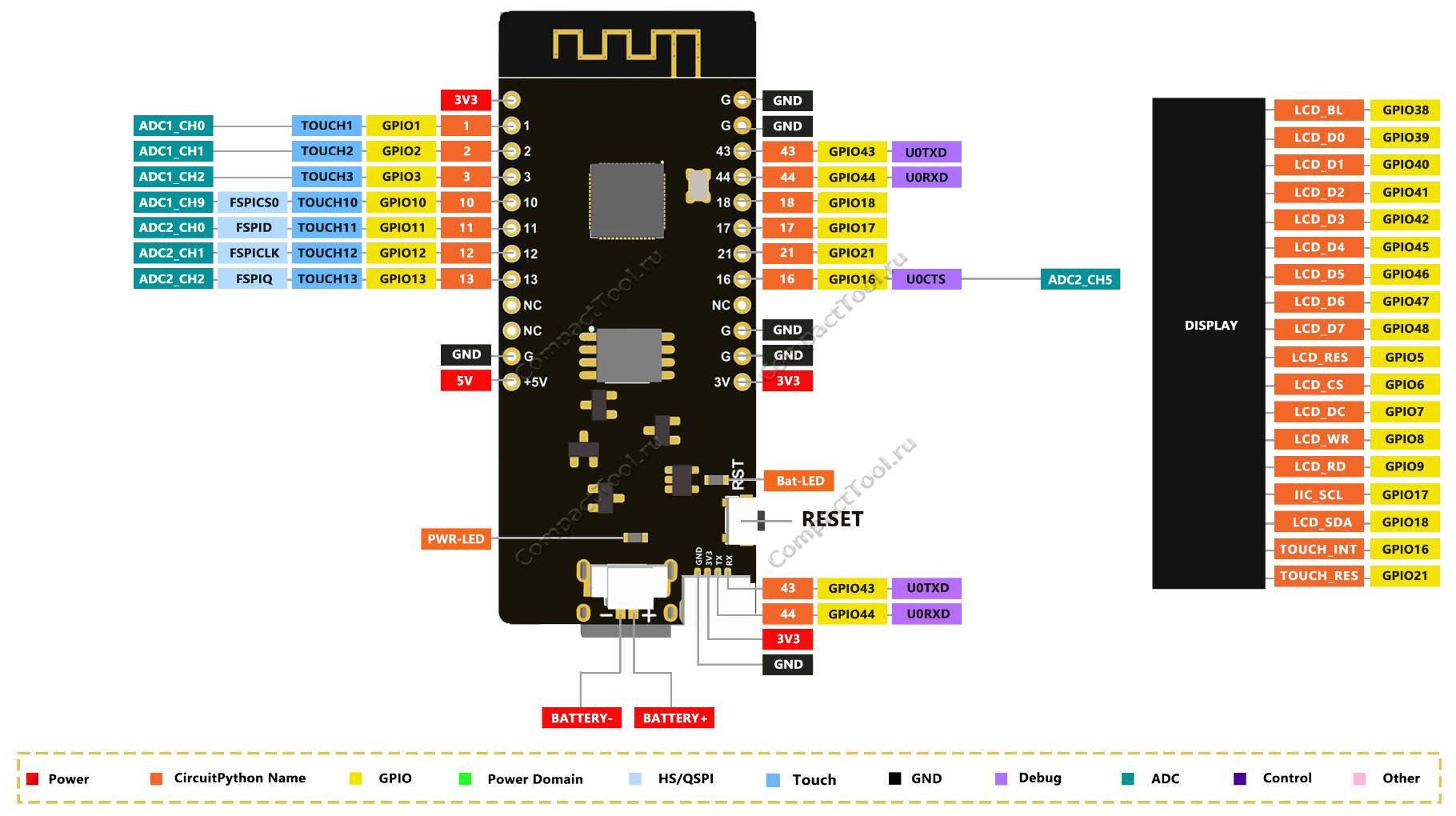 В основе модуля Lilygo T-Display S3 Touch используется 2-ядерный 32-разрядный процессор ESP32-S3 с архитектурой Xtensa LX7 и тактовой частотой 240МГц, со встроенными интерфейсами беспроводной связи 2.4ГГц WiFi-4 + Bluetooth 5.0/BLE. Чип ESP32-S3 объединяет с собой большой объём памяти 16МБ и PCB-антенну, к нему подключен яркий цветной дисплей с матрицей IPS TFT размером 1.9 дюйма и графическим разрешением 320 х 170 пикселей. Несъёмный дисплей надёжно закреплён в пластиковой рамке, приклеенной к плате специальным компаундом. Взаимодействие в части управления системой питания модулем и режимами загрузки ESP32-S3 организовано пользовательскими кнопками. Нативный USB-порт контроллера ESP32-S3 предусматривает опции обновления ПО и последовательной коммуникации в режимах USB OTG, USB Serial / JTAG и USB DFU без помощи внешних USB-TTL преобразователей. Поддержка автономной работы Lilygo T-Display-S3 ESP32 Touch обеспечивается коннектором внешней аккумуляторной батареи в паре с микросхемой контроллера заряда-разряда, подпитывающей током 580мА. Свободные порты ESP32-S3 располагаются по краям платы с её обратной стороны, комбинируют многочисленные интерфейсы ESP32-S3, позволяют контактировать с подходящим оборудованием или расширениями. В качестве приятного бонуса ко всему арсеналу на плату инсталлирован коннектор Qwiic, привносящий Lilygo T-Display S3 ESP32 Touch дополнительную сочетаемость с одноимённой системой соединяемых электронных модулей, разработанных производителем электроники SparkFun.