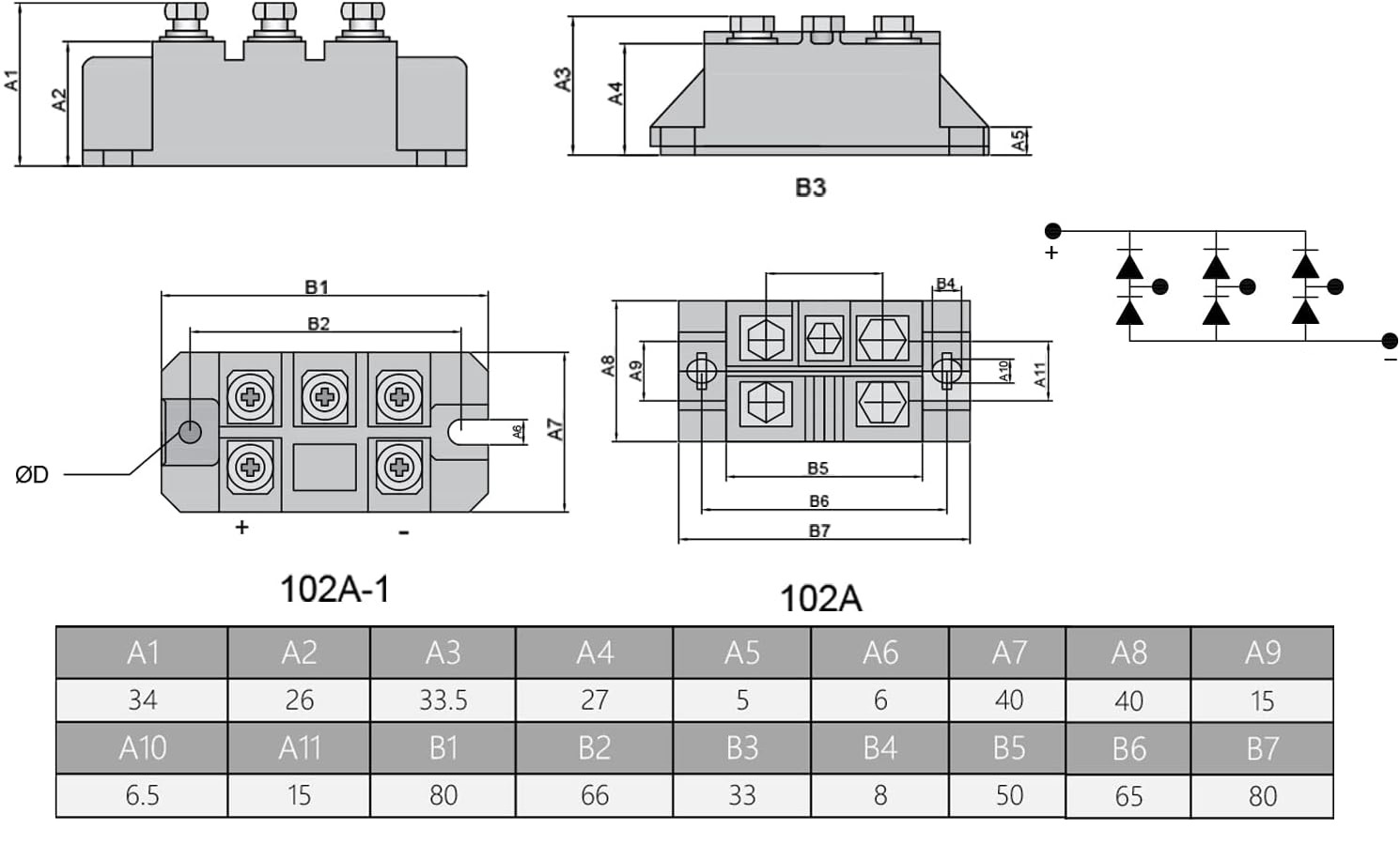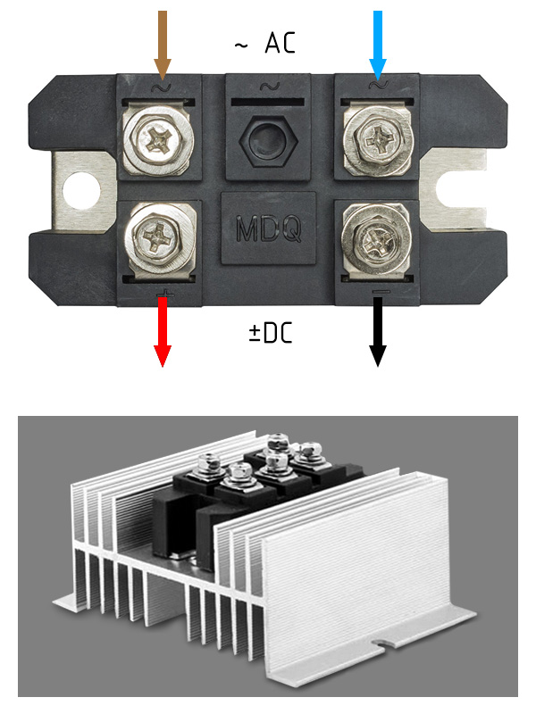 Выпрямительная диодная сборка (диодный мост) — ключевой элемент системы питания для большинства электрических устройств, включая моторы и различную электронику. Примеры использования силового выпрямителя: в импульсном источнике энергии, в системе питания двигателя, в зарядно-разрядных схемах и др. Диодный мост MDQ100-18 предназначен для эксплуатации в однофазных электросетях. Он отвечает за преобразование напряжения переменного тока (~AC) в напряжение постоянного тока (±DC). Модель MDQ100A1800V мощного двухполупериодного диодного выпрямителя рассчитана на нагрузки продолжительного потребления напряжения до 1800 вольт с током не более 100А. Для соблюдения нормального охлаждения MDQ100A1800V требуется монтаж на внешний радиатор с оребрением, рекомендуемые размеры — не менее 125 х 95 х 50 мм.