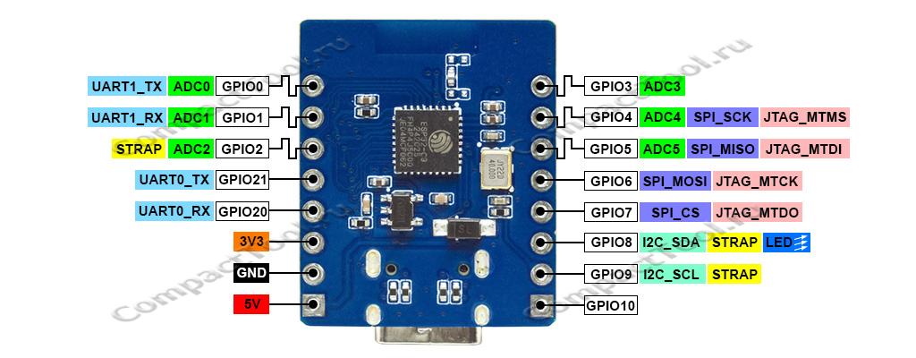 | 0 | Ввод-вывод | GPIO0 Контакт общего назначения ESP32-C3 Аналоговый вход ADC0 Интерфейс UART1 канал исходящих данных TXD Выход с поддержкой ШИМ |