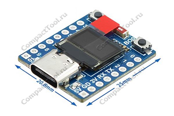 В схему платы включён монохромный OLED-дисплей с диагональю 0.42 дюйма и разрешением 72 х 40 белых пикселей. Из-за столь малого размера, использованием 0.42" OLED-дисплея для вывода графических изображений с информацией может оказаться нецелесообразным. В тоже время этот ЖК-экран идеален для демонстрации крупным шрифтом одного-двух значений в буквенно-цифровом представлении какой-либо характеристики приложения.