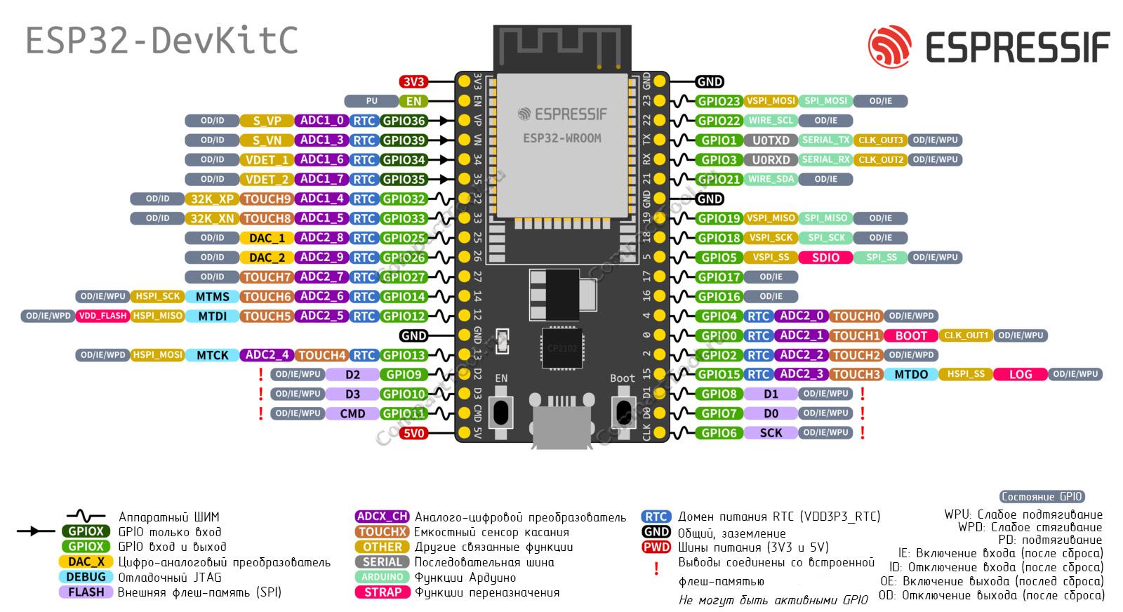 - RTC(GPIO0) ~ RTC(GPIO39) — входы домена питания реального времени RTC. Поддерживается операция пробуждения ESP32 из режима лёгкого сна