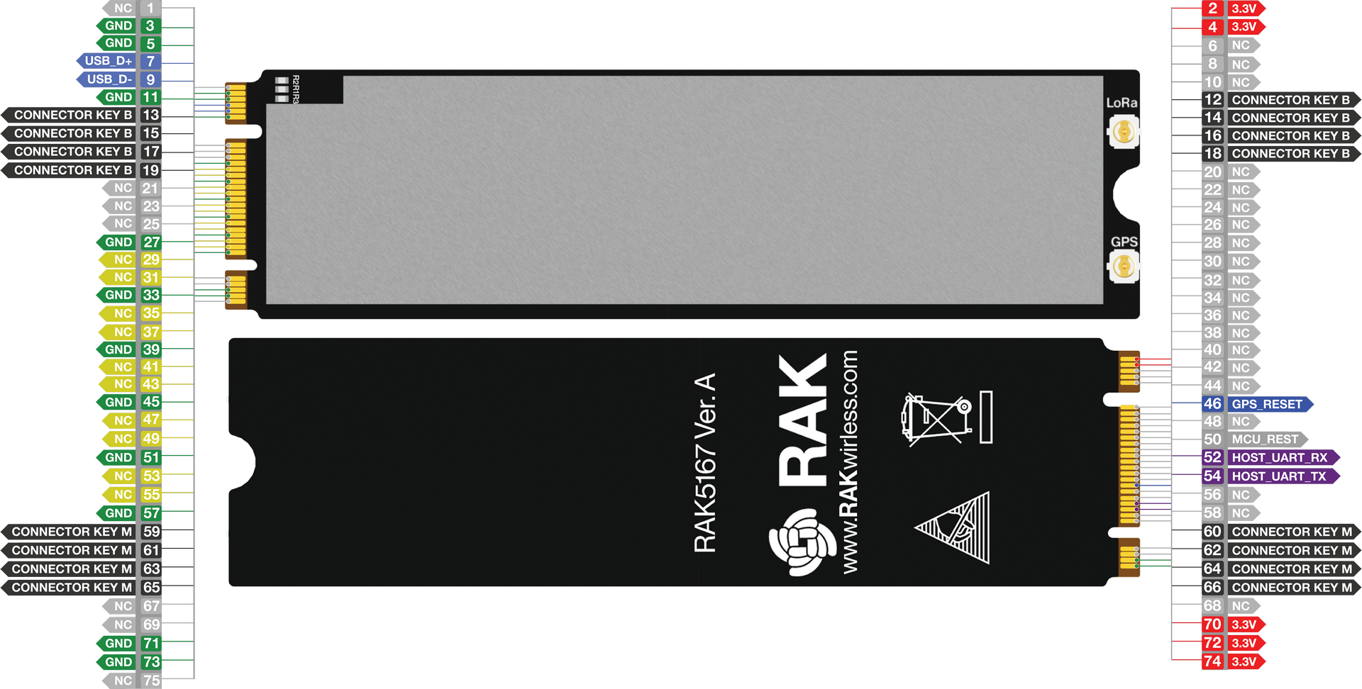 Компактность базовой станции RAK5167 LPWAN предусматривает возможность интеграции модуля даже в такие системы, для которых характеристики веса и величина размеров являются основными. Дизайн RAK5167 разработан с учётом форм-фактора PCI Express M.2 Type 2280, поэтому он легко может быть частью продуктов и совместим со стандартами, позволяющих использование карт толщиной не менее 3.7 мм. Плата имеет два коннектора MHF4 I\iPEX для внешней антенны LoRa и GNSS, и типовой 75-контактный торцевой разъём M.2 с двумя метками Key-B и Key-M.