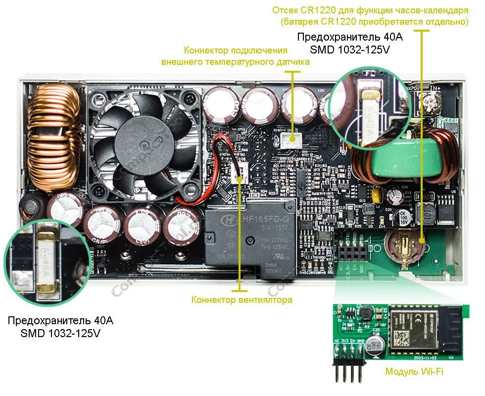 Плата DC-DC регулятора напряжения и тока имеет часы реального времени с календарём, работающие на автономном источнике энергии в виде одного элемента CR1220. Часы задействованы в режиме ведения электронного журнала записей изменения электрических параметров прибора. Литиевая батарейка CR1220 не входит в комплектацию, приобретается отдельно, и устанавливается в специальный отсек держателя с обратной открытой стороны панели RD6030W.