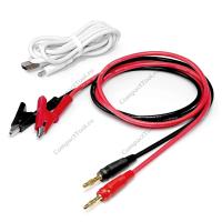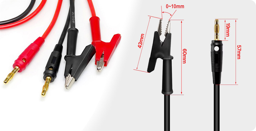 Силовой кабель длиной 1 метр изготавливается из многопроволочной медной жилы сечением 13AWG, покрытой термостойкой силиконовой изоляцией, выдерживающей самые экстремальные температурные условия от -60°С до +200°С. С одной стороны, токопроводящий кабель оснащается концевыми соединителями типа "крокодил" с широким 10-миллиметровым захватом для полкючения к электрическим контактам аккумуляторной батареи или другой нагрузки. Со второй стороны — концевыми соединителями типа "банан" из красной меди с золочённым напылением, вставляющимися в соответствующие по цветовой раскраске клеммы выходного напряжения RD60XX. Каждый концевой соединитель имеет защиту из мягкого пластика, обеспечивающего максимальный уровень безопасность в процессе эксплуатации.